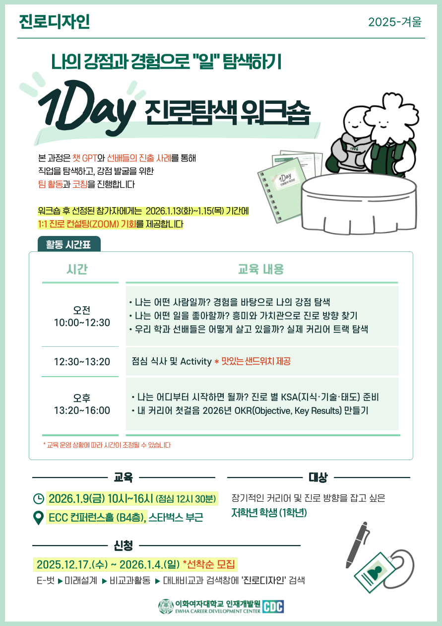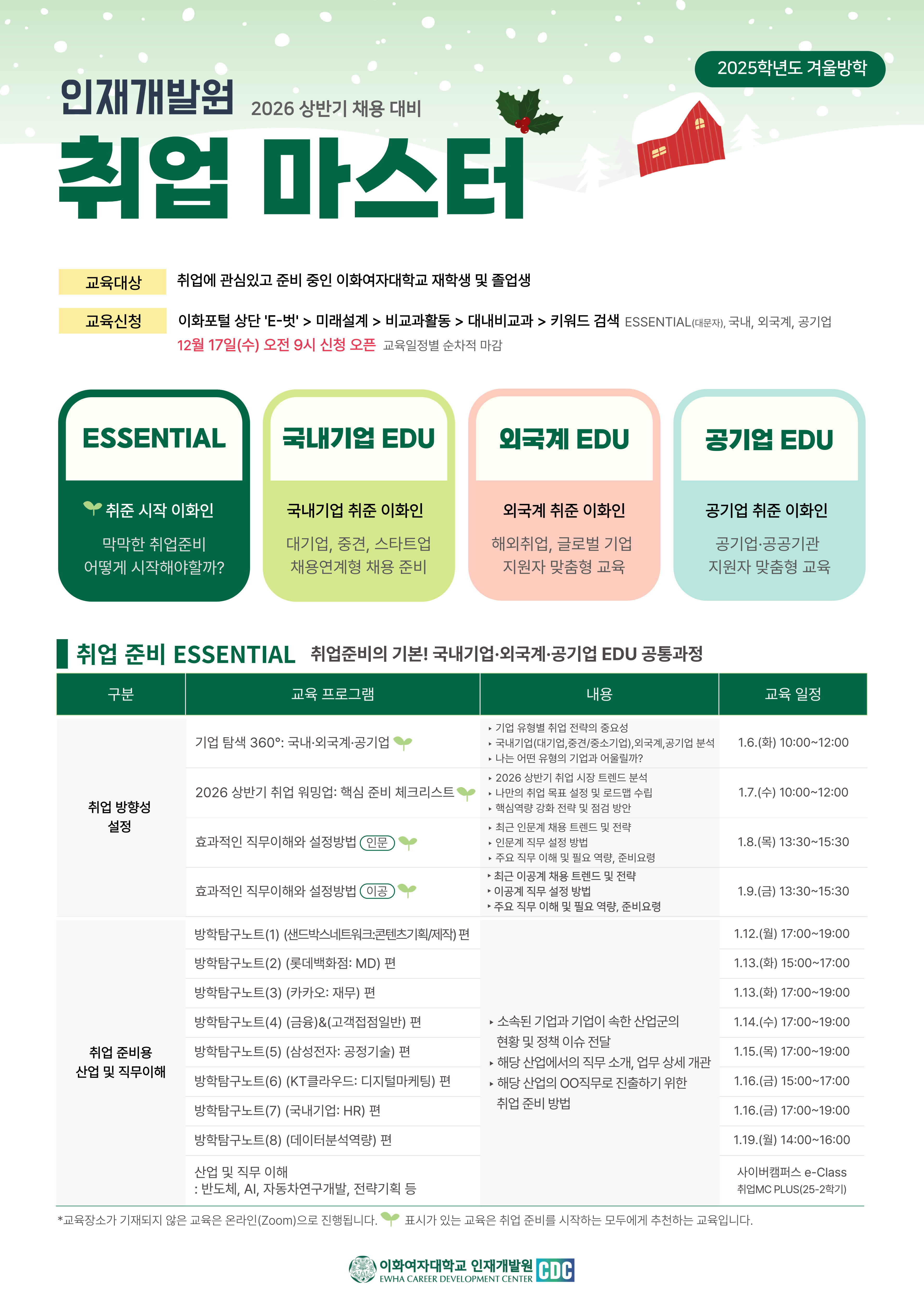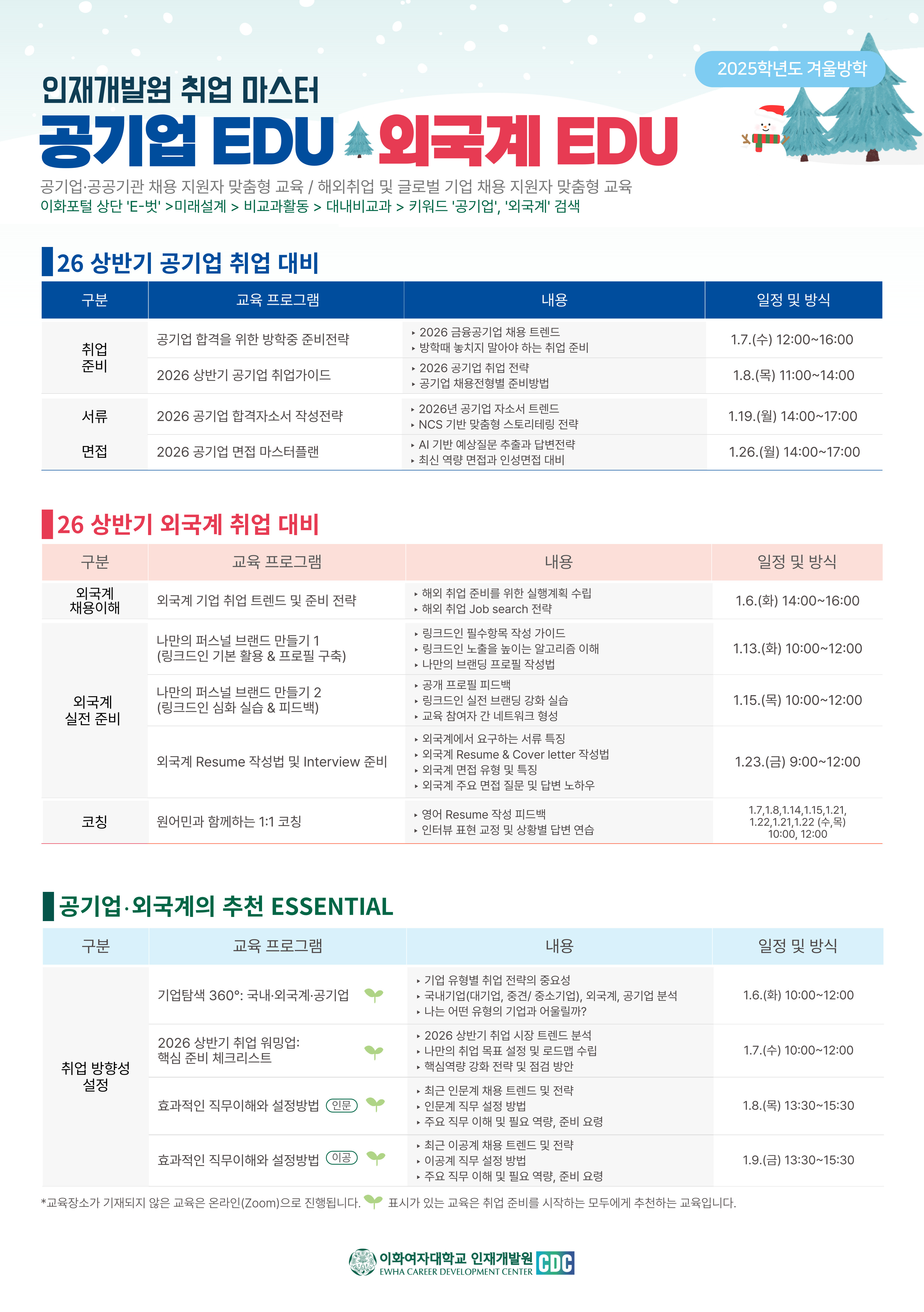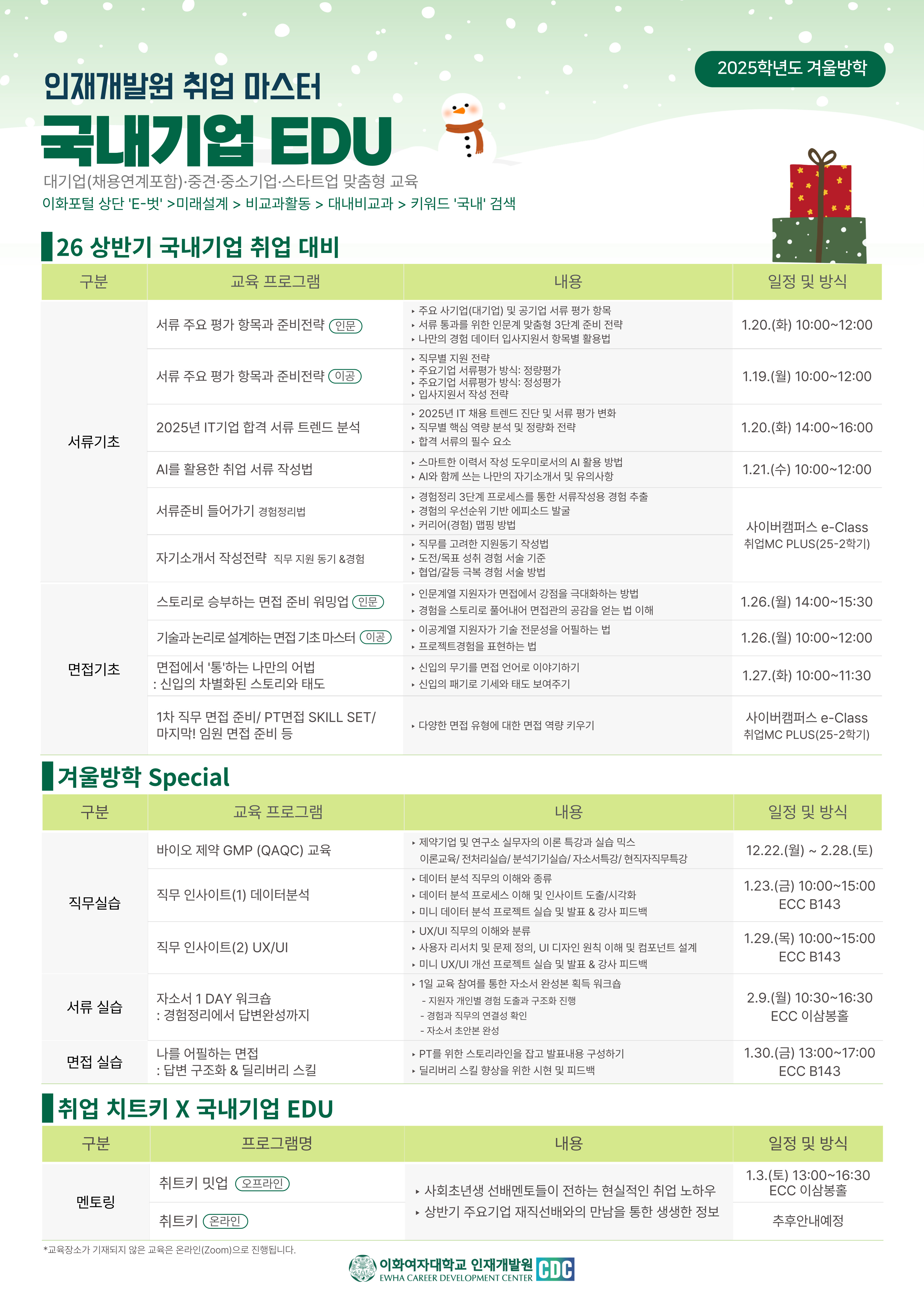 인재개발원에서 개설하는 2025학년도 겨울방학 진로·취업 교육프로그램을 다음과 같이 안내드립니다.